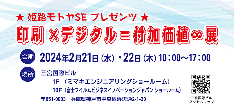 さて、弊社では令和6年2月21日(水)・22日(木)に神戸 三宮国際ビルにて姫路モトヤ主催の「印刷×デジタル=付加価値∞展」を開催いたします。姫路モトヤのSE視点で、印刷業界に対してのご提案を行う展示会です。